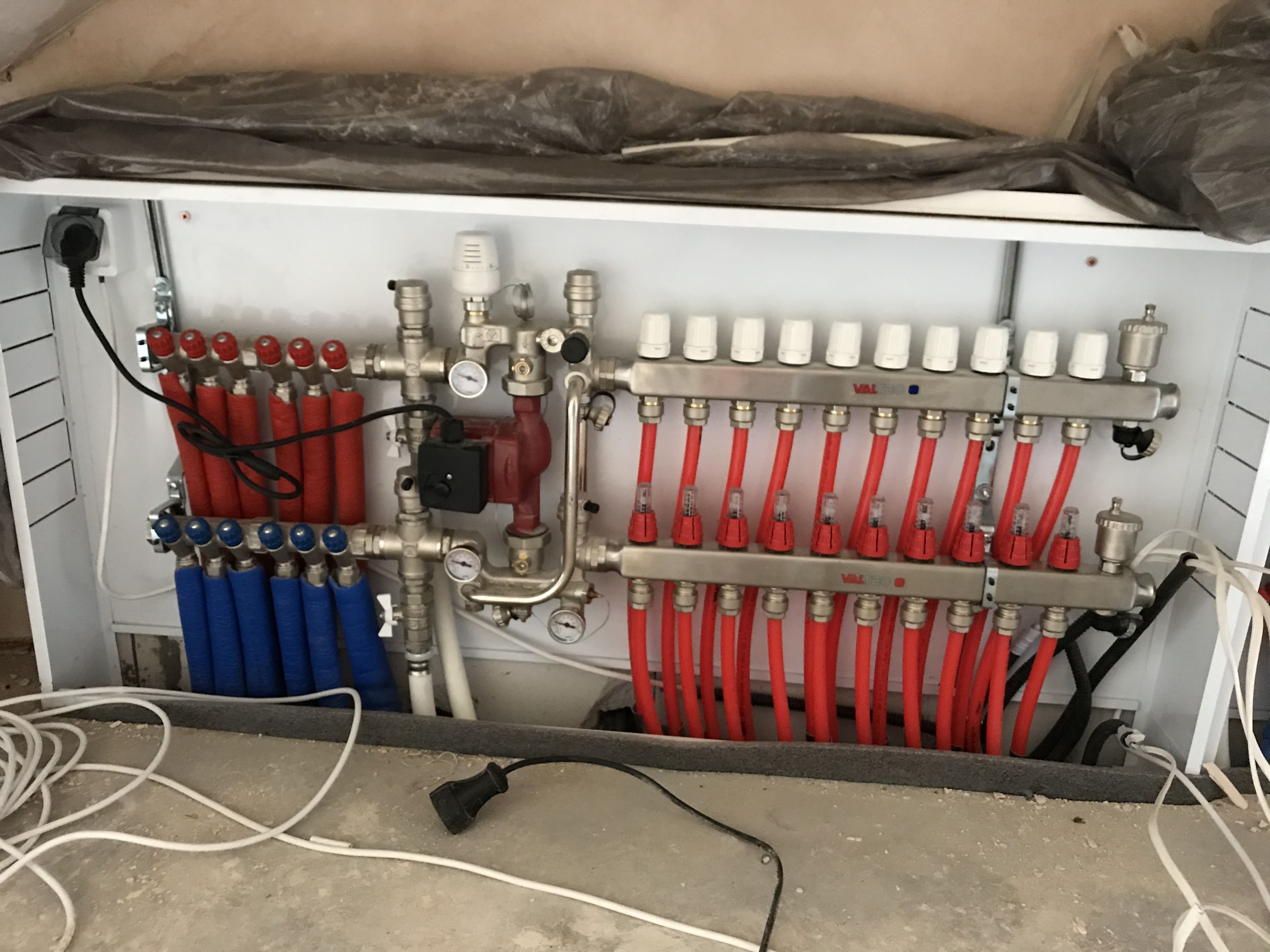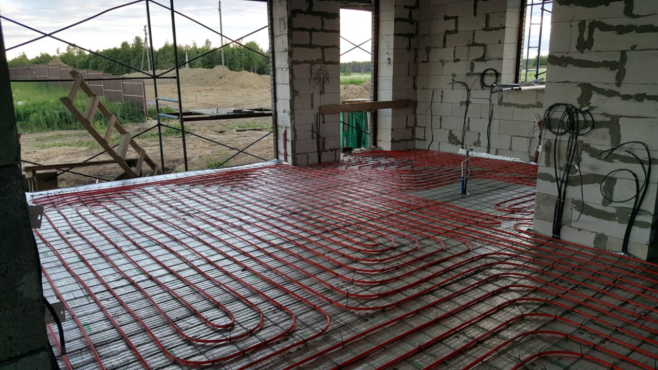 На первом этаже смонтирована система теплый пол на стальную сетку, трубой VALTECPEX-A. По всему первому этажу.