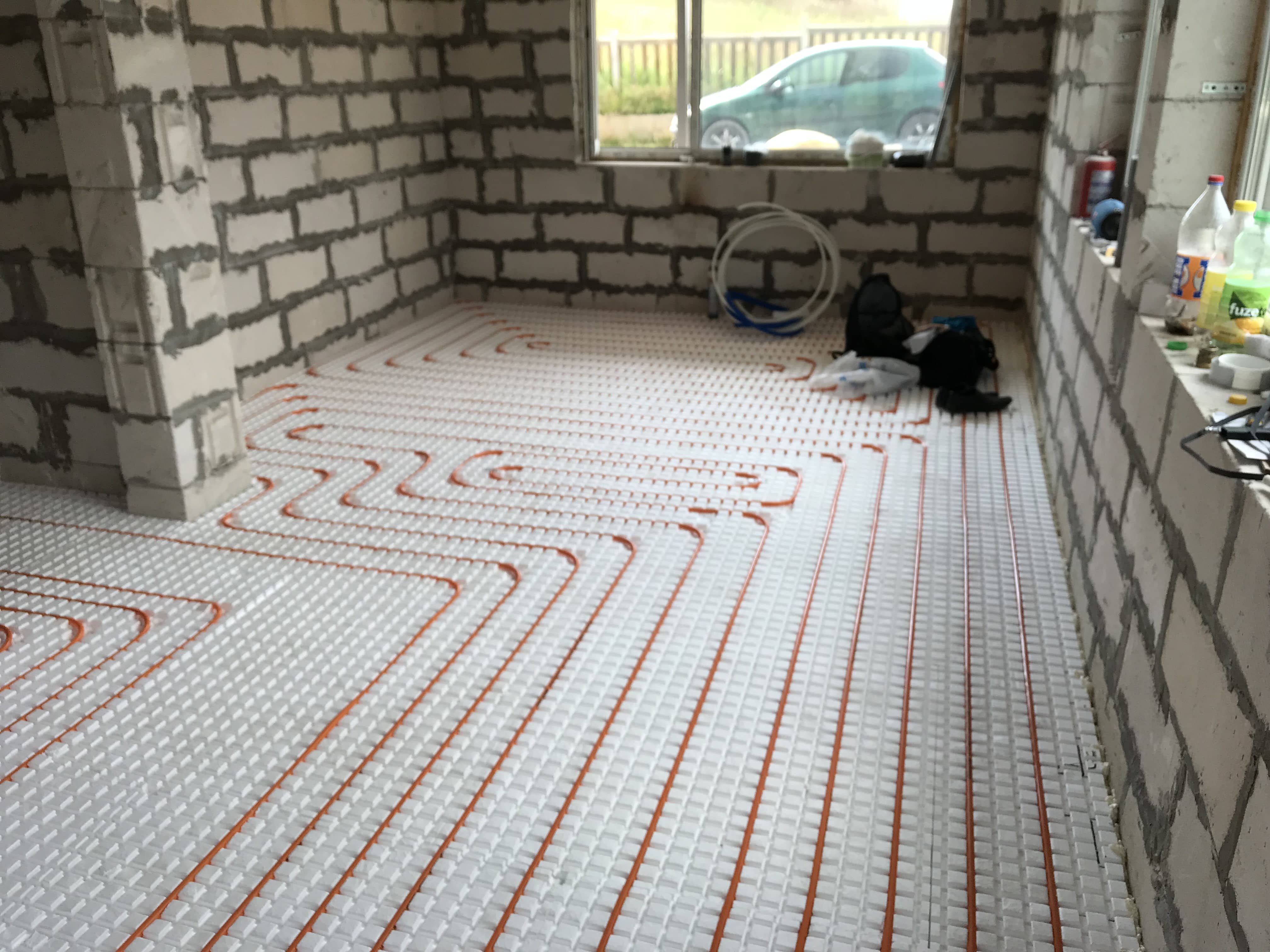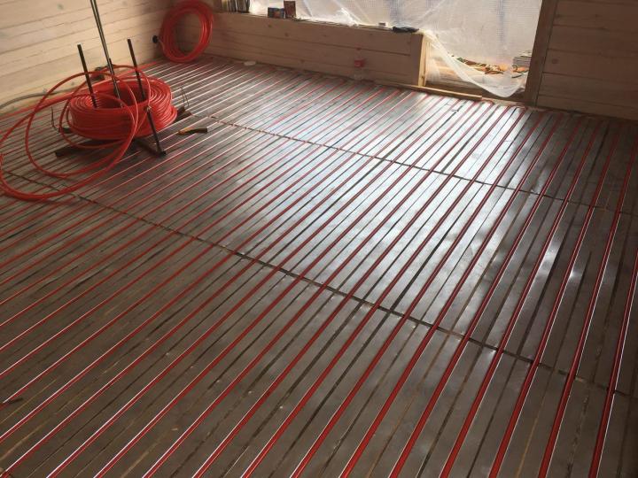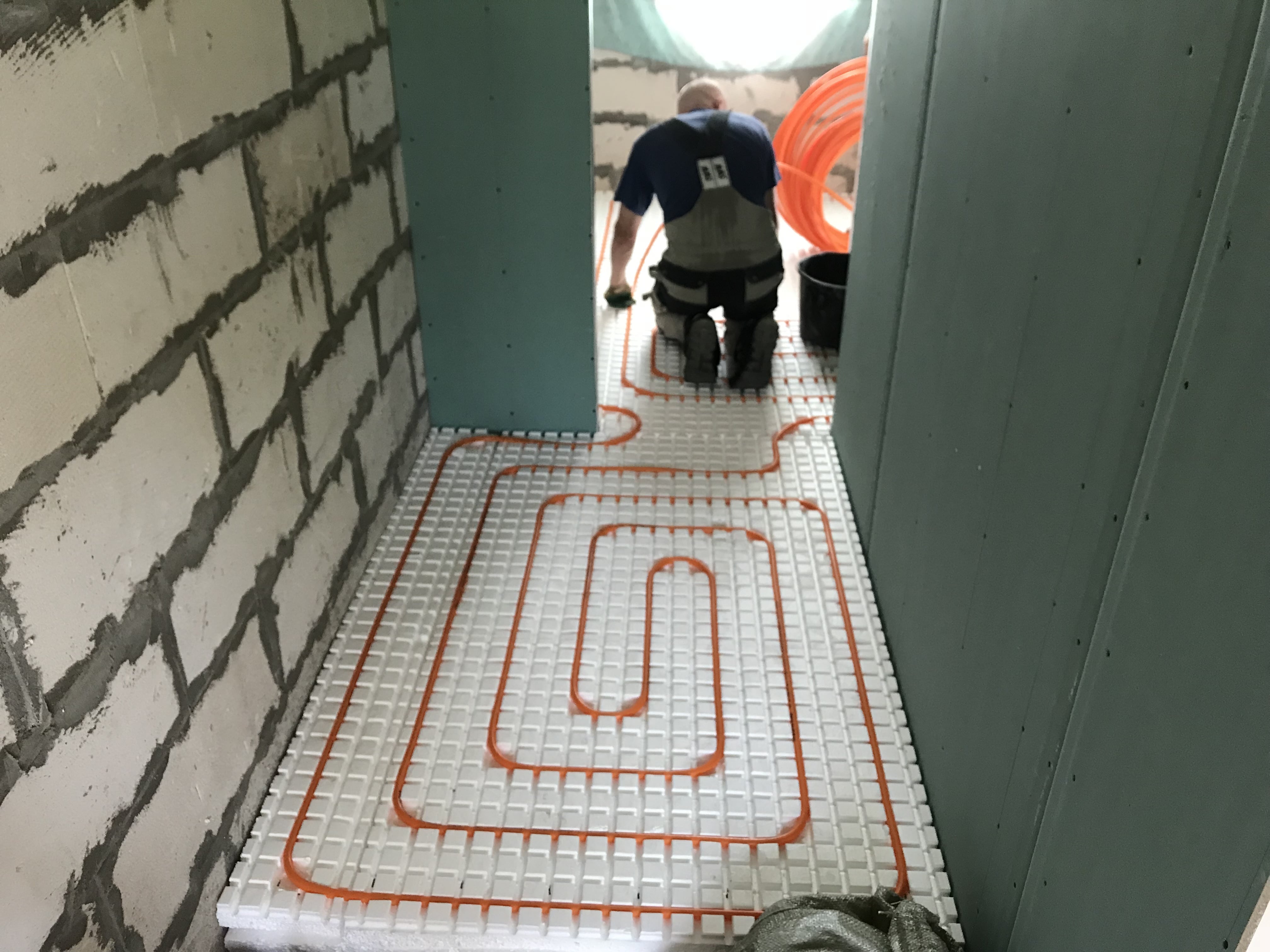 - Монтаж теплого водяного пола на первом этаже (60кв.м) трубой PE-RT 16х2.0 на специализированные маты